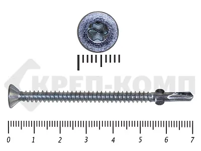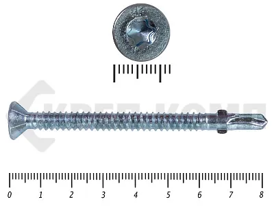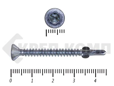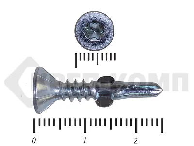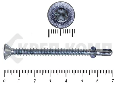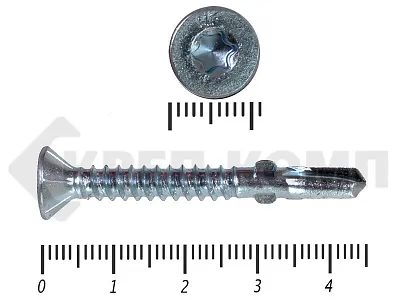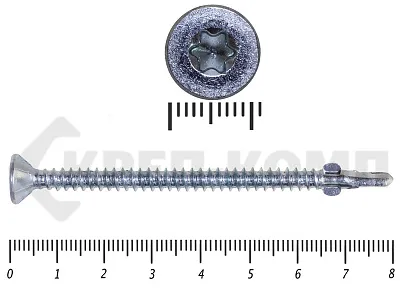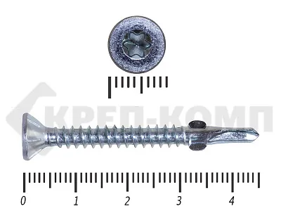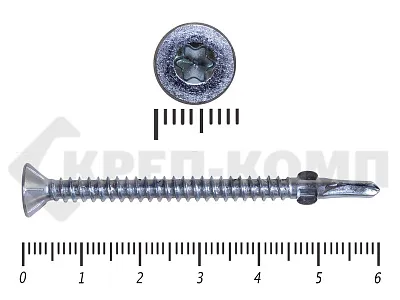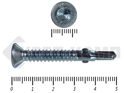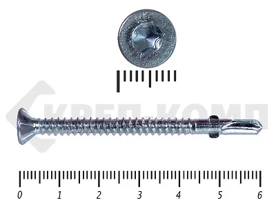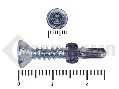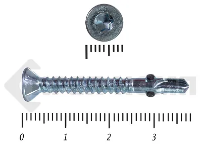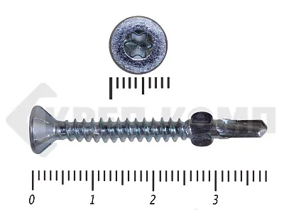 Конструкционные (Флюгельные) саморезы (дерево-металл), применяются для крепления деревянных досок к металлическим конструкциям. На конце самореза, чуть выше сверла, есть ушки, которые при прохождения дерева, рассверливают его, для тог, что бы саморез не касался стенок доски. Это делает закручивание самореза более простым, и надежнее прижимает доску к металлическому основанию. Кода сверло самореза достигает металла, ушки обламываются, и далее саморез легко вкручивается в металл, прижимая доску.